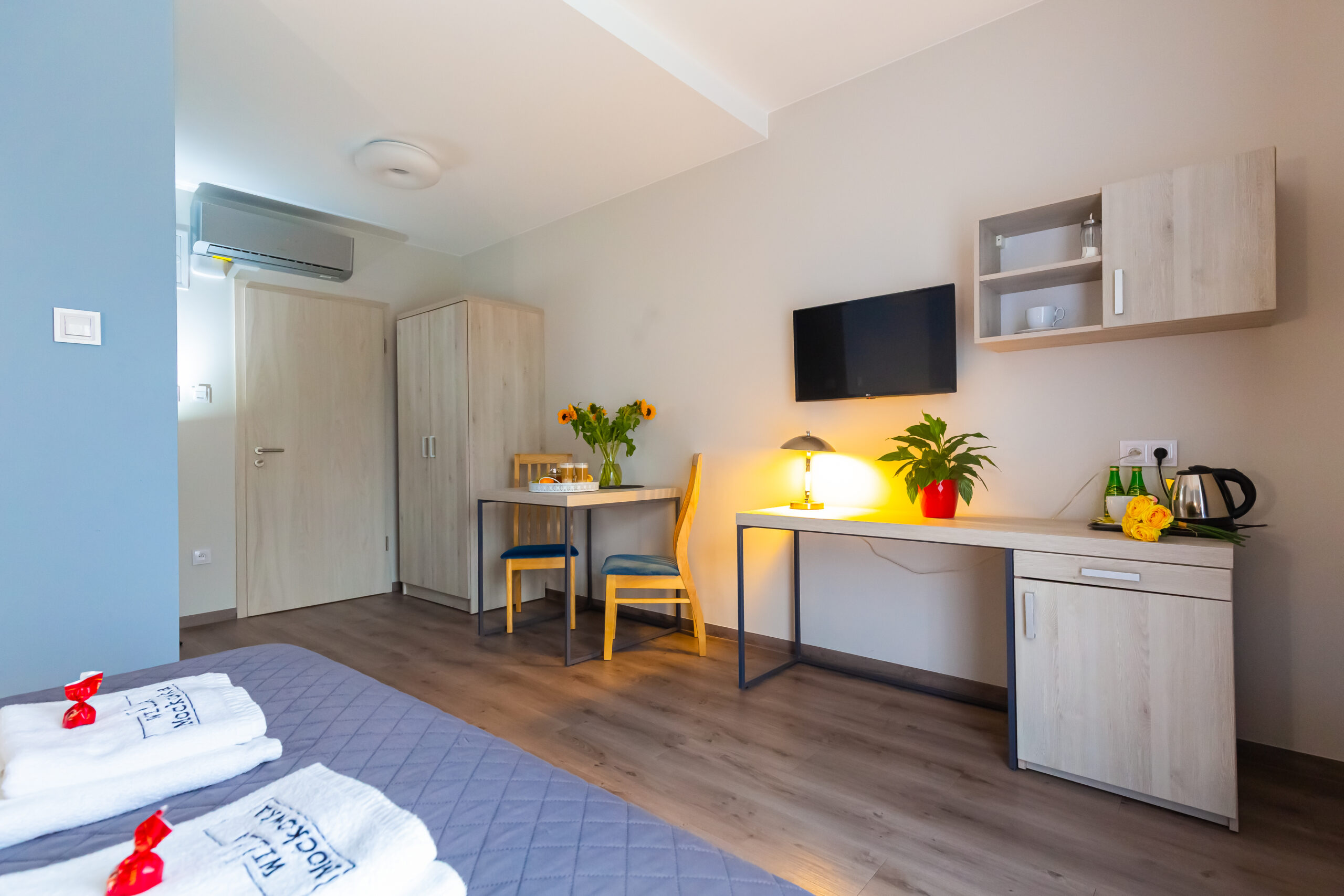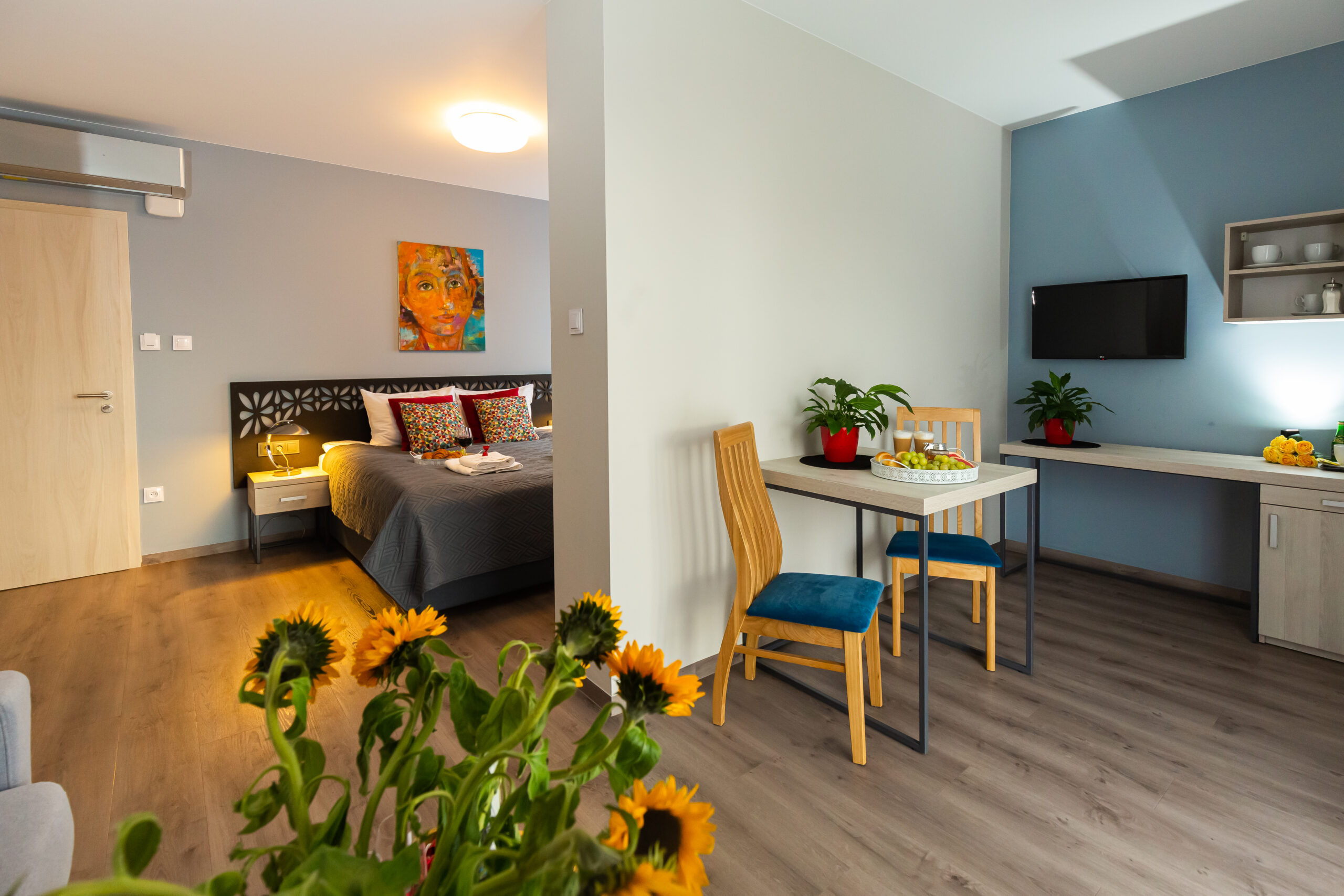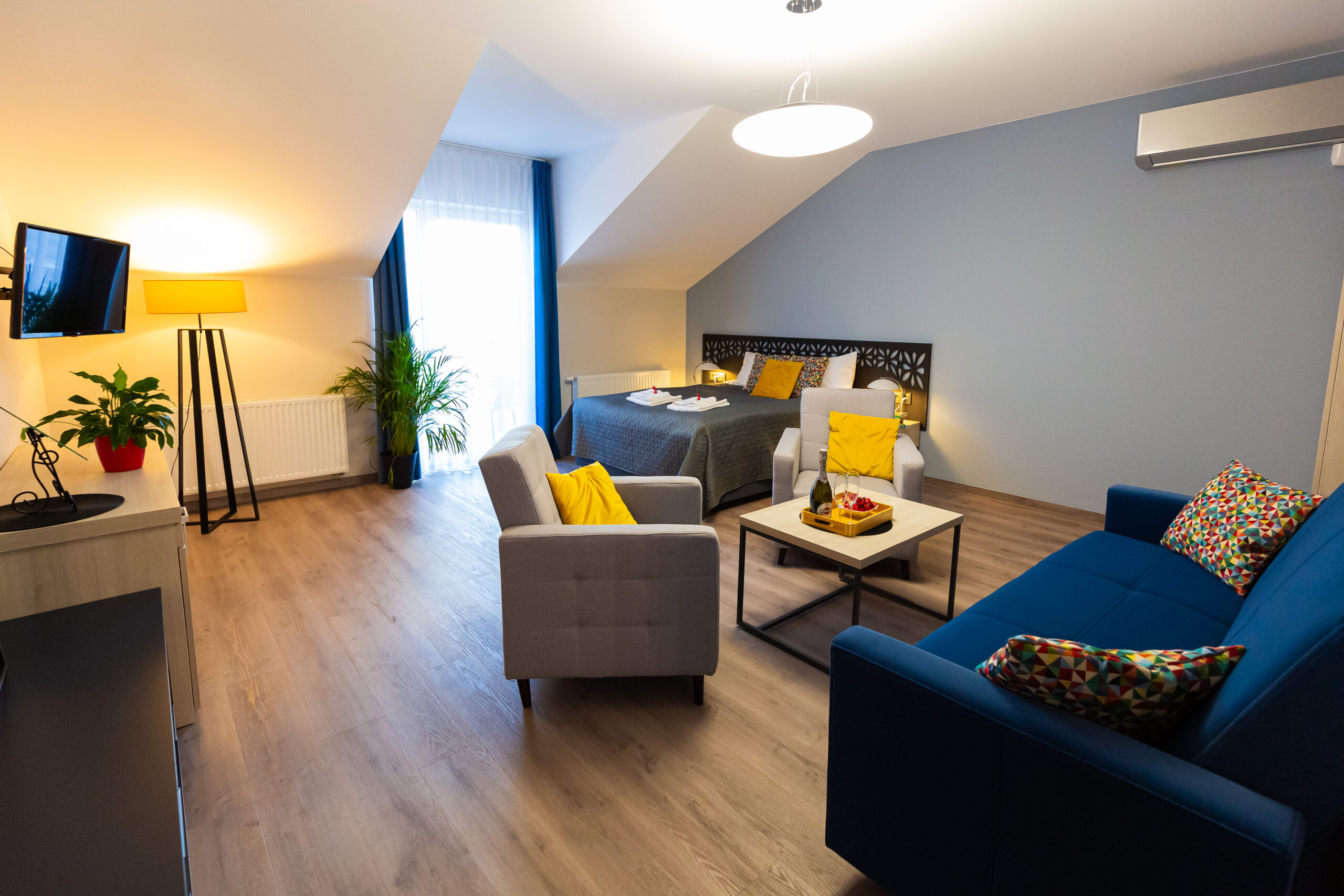 Apartament składa się z salonu połączonego z sypialnią, gwarantując prywatność i spokój. Wygodne łóżka gwarantują doskonały sen i pełen relaks. Wysokiej klasy pościel i sprzęt dodają eleganckiego uroku.